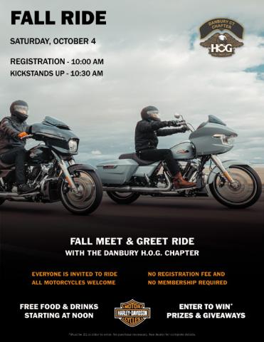 Registration is FREE. Our Road Captains will lead a great 1+ hour ride, then we'll head back to the dealership for a Fall BBQ Bash celebrating the 30th Anniversary of H-D of Danbury AND the Danbury H.O.G. Chapter!